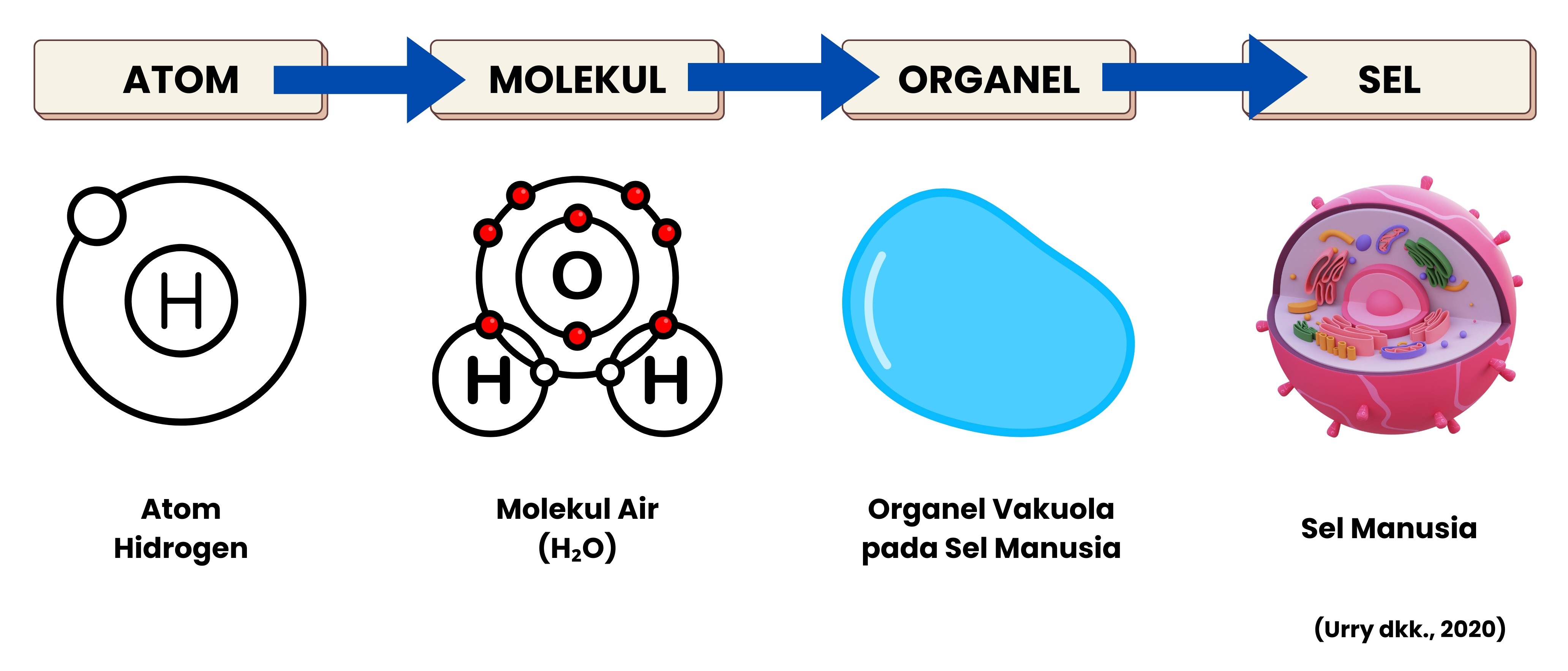 Gambar 1. Tingkat organisasi biologis. Urutan dari yang paling kecil. Atom, Molekul, Organel, dan Sel